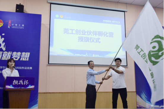 第一期莞工创业伙伴孵化营学生代表黄华朗同学进行发言。黄华朗同学为大家分享自己成为第一期莞工创业伙伴孵化营成员的喜悦和开拓创新、追求卓越的决心,展现出创新创业人的蓬勃朝气。随后,李忠红副书记为第一期莞工创业伙伴孵化营授旗