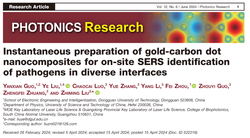 近期,东莞理工学院电智学院刘晔教授课题组博士后郭艳先以第一作者身份在学校T类二级期刊《Photonics Research》以“Instantaneous preparation of gold-carbon dot nanocomposites for on-site SERS identification of pathogens in diverse interfaces”为题发表研究论文,东莞理工学院刘晔教授与华南师范大学刘智明教授为共同通讯作者。《Photonics Research》为中科院光学一区TOP期刊,影响因子为7.6。