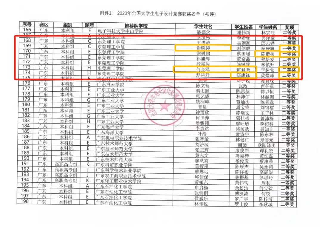 近期,TI杯2023年全国大学生电子设计竞赛总测评在山东成功举办。我院学子在本届竞赛中摘取全国一等奖1项、全国二等奖2项、广东省一等奖1项、广东省二等奖4项、广东省三等奖5项的好成绩。其中谢晓涛队伍、陈楷杭队伍获得全国一等奖。自2023年春季学期开始,学院便开启本届大学生电子设计竞赛的组织和动员工作。一方面是启动赛前宣传和选拔,另一方面进行培训,为参赛候选队提供技术、场地、材料等多方面的支持。
