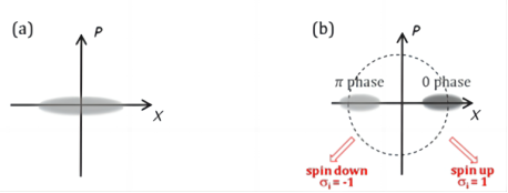 飞秒简并光学参量振荡器(degenerate optical parametric oscillator, DOPO ) 在简并参数放大过程中产生的信号光的正交振幅分量被反压缩,正交位相分量被压缩,且只能在0和π两种相位状态之一振荡(如图8)。