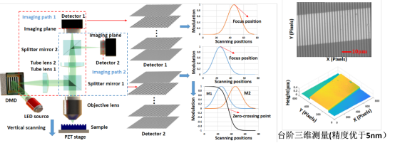 基于编码成像差分探测纳米级三维测量在编码图像在焦面处成像最清晰,调制度取得最大值,通过构建差分探测系统,提取差分调制度零点所在位置实现高精度三维形貌重构。