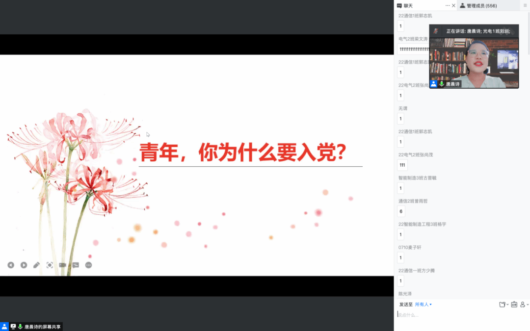 入党是为了追求卓越的自己。唐老师以向往的大学生活为契机启发新生,对大学的向往和期待是在寻求自我实现,而加入党组织能使青年人坚定马克思主义理想信念,拥有强大的人生意义系统,能在入党的经历中,更加清晰的认识自己,更加明确目的,更加接近期待中的自己。